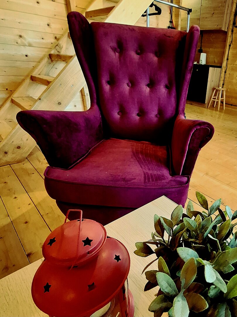 Domek nr 2 "Bordowy" ma ok 55m2. Posiada na parterze: sypialnię małżeńską, salon z rozkładaną sofą, aneks kuchenny, łazienkę. Na piętrze antresolę z miejscem do spania dla dwóch osób (dwa pojedyńcze materace). Salon ma wygodną sofę oraz duży stół w części jadalnianej. Kuchnia posiada pełne wyposażenie w naczynia, sztućće, garnki, płytę indukcyjną oraz dużą lodówkę z zamrażarką. Przygotowywanie posiłków to u Nas przyjemność. Domek ma duży zadaszony taras z wygodnymi meblami ogrodowymi odpowiednimi do odpoczynku oraz biesiadowania. Grill oraz miejsce na ognisko znajduje się przy domku i jest do prywatnego użytku.