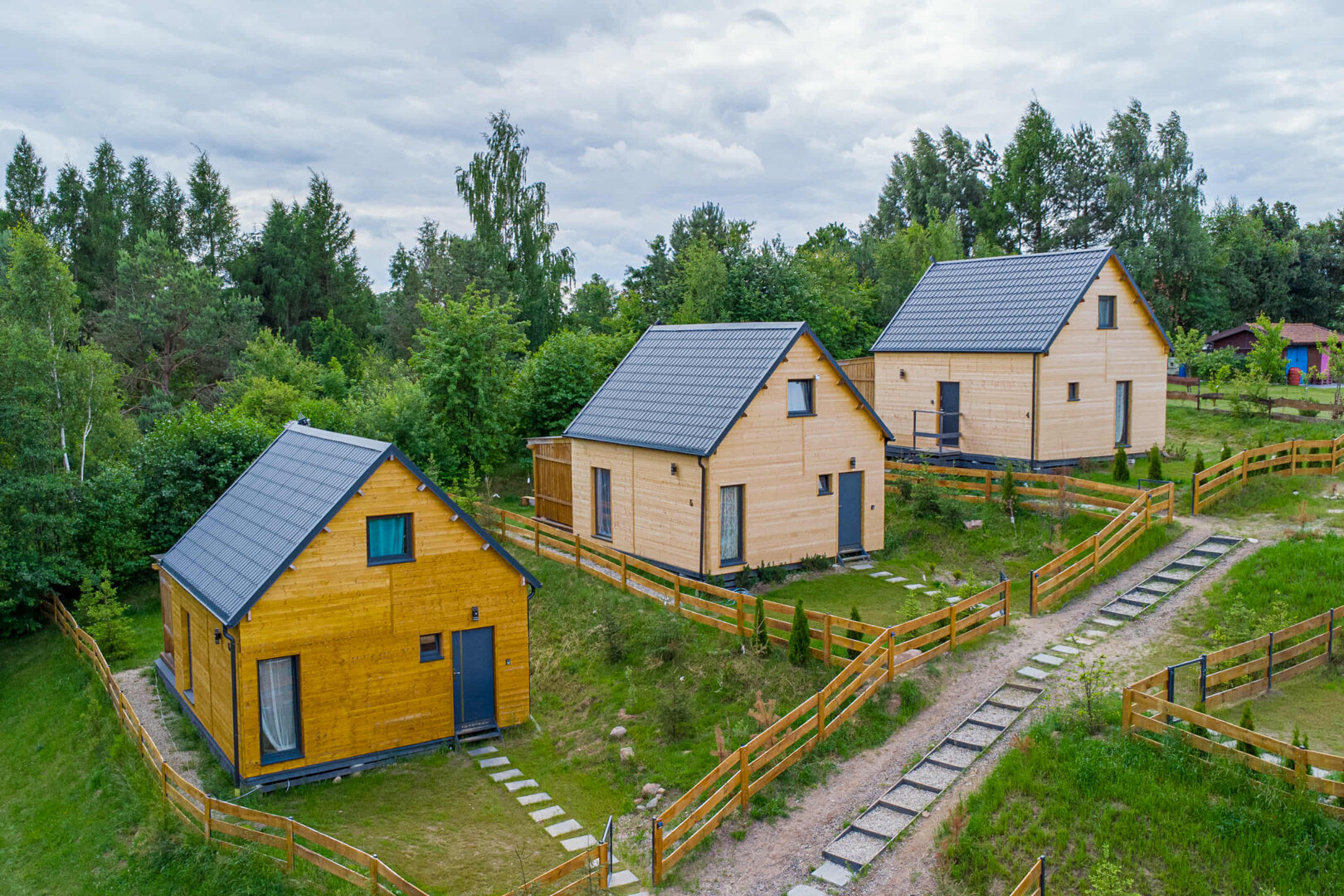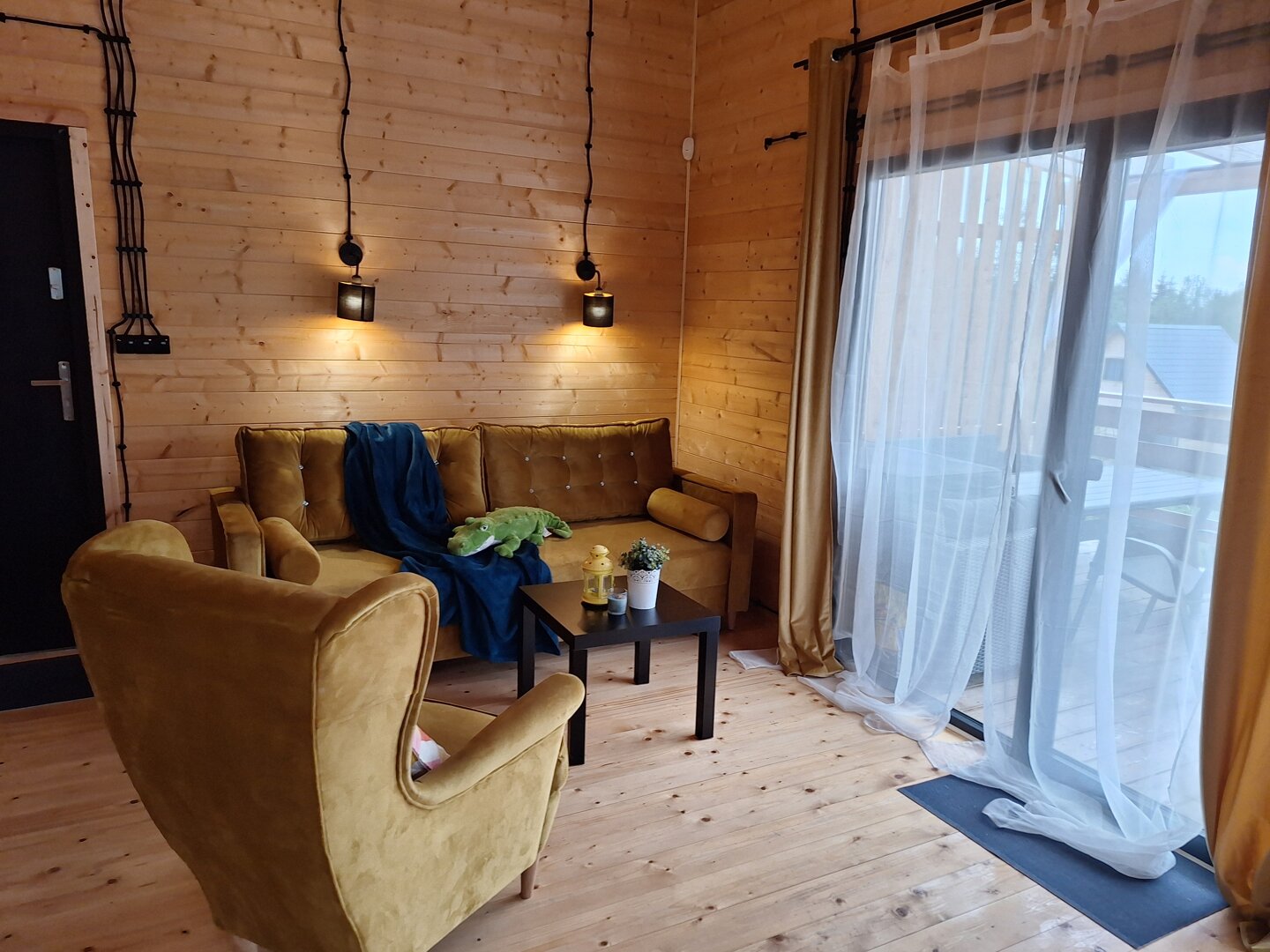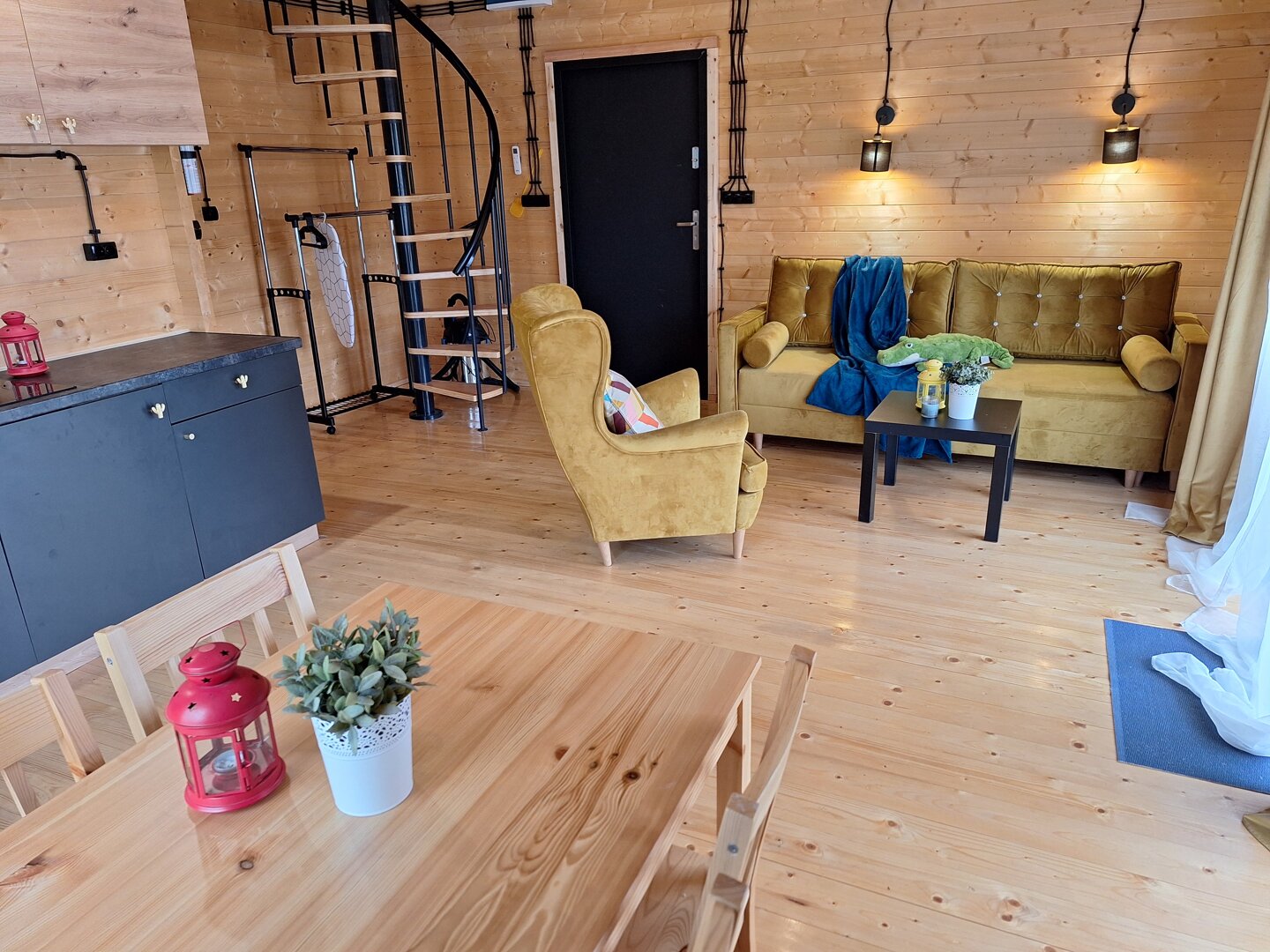 Domek nr 3 "ZŁoty" ma ok 55m2. Posiada na parterze: sypialnię małżeńską, salon z rozkładaną sofą, aneks kuchenny, łazienkę. Na piętrze antresolę z miejscem do spania dla dwóch osób (dwa pojedyńcze materace). Salon ma wygodną sofę oraz duży stół w części jadalnianej. Kuchnia posiada pełne wyposażenie w naczynia, sztućće, garnki, płytę indukcyjną oraz dużą lodówkę z zamrażarką. Przygotowywanie posiłków to u Nas przyjemność. Domek ma duży zadaszony taras z wygodnymi meblami ogrodowymi odpowiednimi do odpoczynku oraz biesiadowania. Grill oraz miejsce na ognisko znajduje się przy domku i jest do prywatnego użytku.